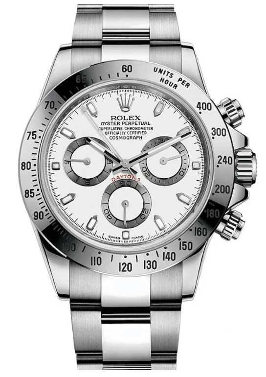 Rolex Daytona Chronograph (ref. 116520; serie V - 2008-2009) en acero inoxidable y esfera blanca con marcadores de hora índice. Bisel interior grabado. Viene con brazalete de acero inoxidable con hebilla desplegable. Se adapta a muñecas de hasta 7-1/2 pulgadas.